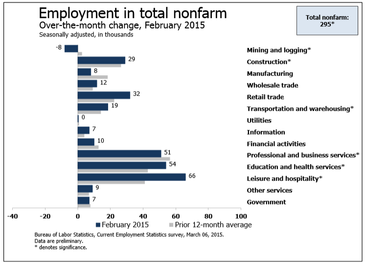 Total nonfarm payroll employment increased by 295,000 in February, and the unemployment rate edged down to 5.5 percent, the U.S. Bureau of Labor Statistics reported today. Job gains occurred in food services and drinking places, professional and business services, construction, health care, and in transportation and warehousing. Employment in mining was down over the month.